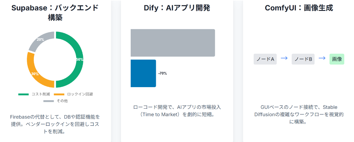 Supabaseは、Firebaseのオープンソース代替として人気を集めているバックエンドサービスです。データベース、認証、ストレージなど、Webアプリケーション開発に必要な機能を提供します。オープンソースであるため、ベンダーロックインを避け、自由にカスタマイズすることができます。