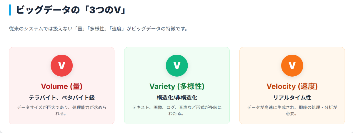 Volume(量)は、データのサイズを指します。テラバイト、ペタバイトといった巨大なデータセットを扱う能力が求められます。Variety(多様性)は、構造化データ、非構造化データ、半構造化データなど、さまざまな形式のデータが存在することを意味します。Velocity(速度)は、データが生成、処理、分析される速度を指し、リアルタイムに近いデータ処理が重要になります。
