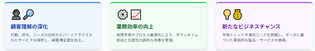 顧客理解の深化は、顧客の行動、好み、ニーズを詳細に分析することで、よりパーソナライズされたサービスや製品を提供できるようになります。これにより、顧客満足度とロイヤルティが向上し、長期的な関係を築くことができます。業務効率の向上は、ビッグデータを活用して業務プロセスを最適化し、無駄を排除することで実現します。