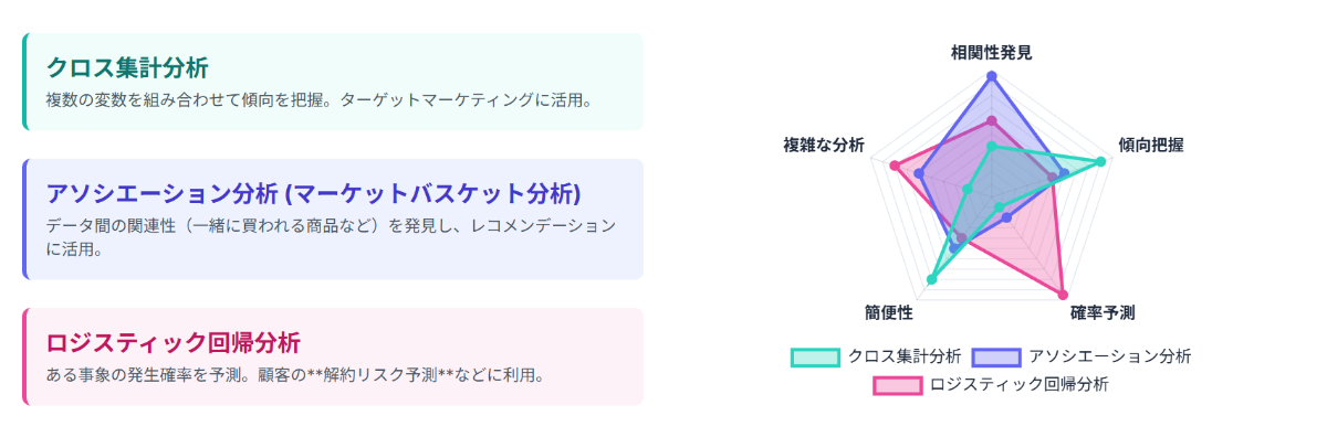 クロス集計分析は、複数の変数を組み合わせてデータの傾向を把握する手法です。顧客の属性と購買行動を組み合わせることで、ターゲットマーケティングに役立てることができます。