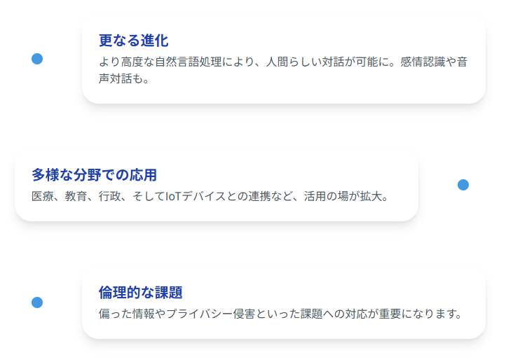 医療、教育、行政など、様々な分野での応用が期待されます。また、IoTデバイスとの連携も進むでしょう。