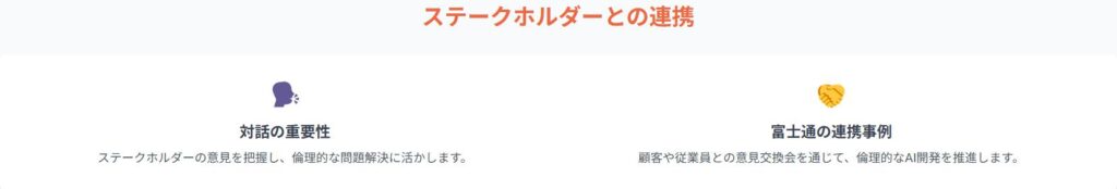 富士通グループは、顧客、従業員、株主、地域社会など、さまざまなステークホルダーとの連携を重視しています。AI倫理に関する意見交換会やワークショップを開催し、ステークホルダーの意見をAIの開発・利用に反映させる取り組みを行っています。顧客に対しては、AI技術の利用に関する情報を提供し、懸念や期待をヒアリングします。従業員に対しては、AI倫理に関する研修プログラムを提供し、倫理的な問題に対する意識を高めます。株主に対しては、AI倫理に関する取り組みを開示し、透明性を確保します。地域社会に対しては、AI技術を活用した社会貢献活動を実施し、AI技術の恩恵を共有します。富士通グループは、これらのステークホルダーとの連携を通じて、AI技術の利用に関する倫理的な問題を解決し、社会的な信頼を得ることを目指しています。ステークホルダーとの連携は、AI技術の持続的な発展を支えるために不可欠です。富士通グループは、今後もステークホルダーとの対話を継続し、AI倫理に関する取り組みを改善していく方針です。