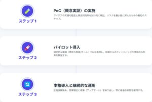 AI導入におけるPoCでは、特定の業務プロセスにAIを試験的に導入し、その効果や課題を検証します。PoCを実施することで、AI導入の実現可能性や費用対効果を事前に把握することができます。また、PoCを通じて、AI導入に必要なデータやインフラ、スキルなどを洗い出すことができます。
