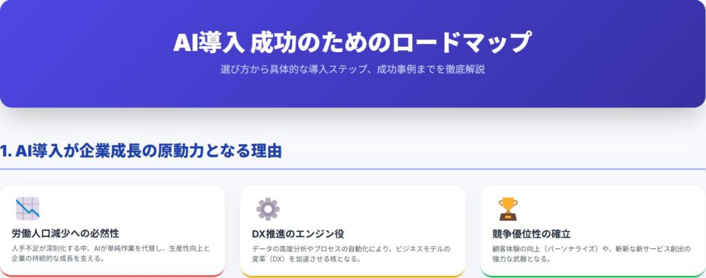 競争が激化する現代ビジネスにおいて、企業が持続的な成長を遂げるためには、競争優位性を確立することが不可欠です。AI導入は、企業が競争優位性を確立するための強力な武器となります。