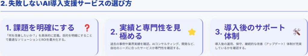 実績と専門性を見極めることで、信頼できるAI導入支援サービスを選ぶことができ、AI導入の成功率を高めることができます。