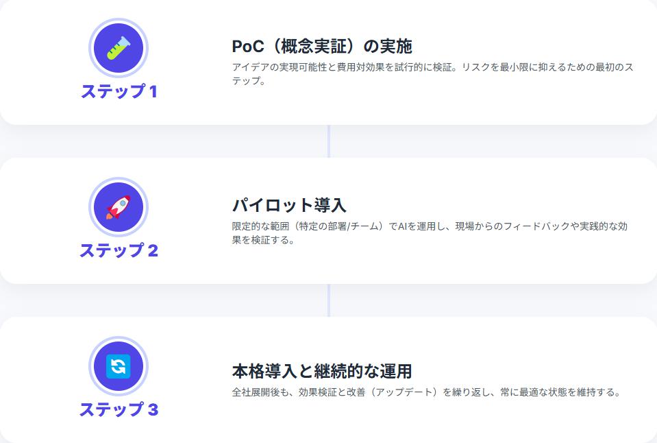 AI導入を成功させるためには、いきなり本格導入するのではなく、まずはPoC(概念実証)を実施することをおすすめします。PoCとは、新しいアイデアや技術の実現可能性を検証するための試行的な取り組みです。