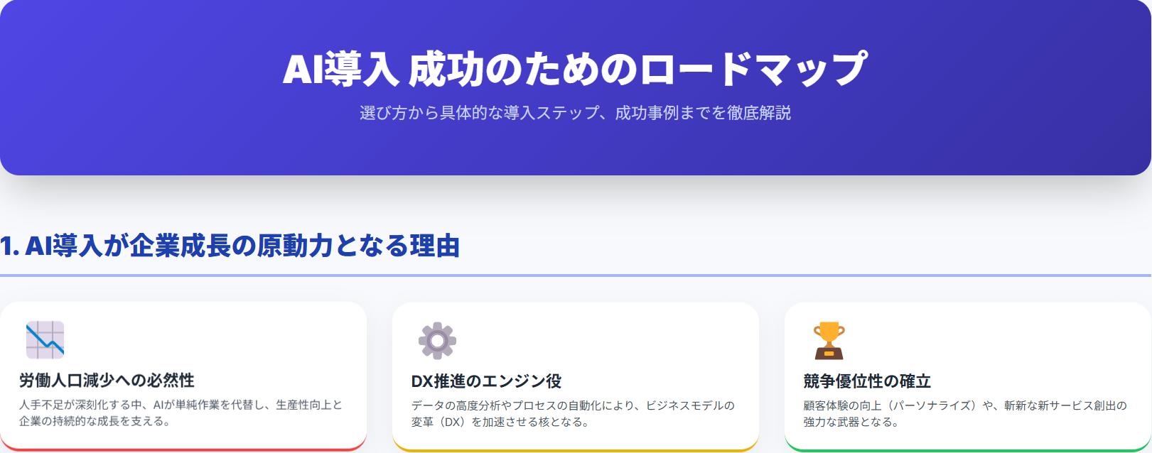 AI導入は、企業が直面する様々な課題を解決し、未来を切り開くための強力な武器となります。労働人口減少、DX推進、競争激化など、現代のビジネス環境は変化が激しく、企業は常に新しい技術を取り入れ、変化に対応していく必要があります。