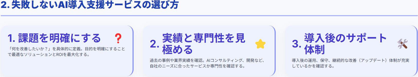 AI導入は、導入して終わりではありません。導入後の運用、保守、改善が非常に重要です。そのため、AI導入支援サービスを選ぶ際には、導入後のサポート体制が整っているかどうかを確認することが不可欠です。