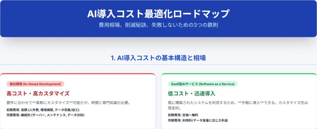 AI導入の形態として、自社開発とSaaSのどちらを選択するかは、費用に大きな影響を与えます。自社開発の場合、初期費用として、開発チームの人件費、開発環境の構築費用、データ収集・加工費用などがかかります。月額費用としては、サーバー費用、メンテナンス費用、データ分析費用などが継続的に発生します。一方、SaaSの場合、初期費用は比較的安価で、月額費用として、サービス利用料、データ容量に応じた料金などがかかります。運用費用としては、SaaSベンダーが提供するサポート費用や、自社で必要な設定・運用費用が発生します。長期的な視点でコストパフォーマンスを比較検討することが重要です。自社開発は、初期費用は高いものの、カスタマイズ性が高く、長期的に見るとコストを抑えられる可能性があります。SaaSは、初期費用を抑えられ、手軽に導入できますが、カスタマイズ性が低く、長期的に見るとコストが高くなる可能性もあります。自社の状況や目的に合わせて、最適な導入形態を選択しましょう。