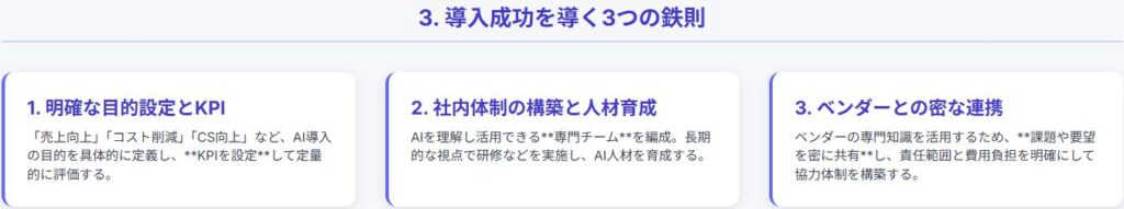 AI導入を成功させるためには、明確な目的設定とKPI(重要業績評価指標)の設定が不可欠です。AIを導入する目的を具体的に定義し、どのような成果を期待するのかを明確にすることで、導入後の効果測定が可能になります。KPIは、AI導入の成果を定量的に評価するための指標であり、売上向上、コスト削減、顧客満足度向上など、目的に合わせて設定します。KPIを設定することで、AI導入の効果を客観的に評価し、改善点を見つけることができます。また、KPIを定期的にモニタリングし、目標達成に向けてPDCAサイクルを回すことが重要です。明確な目的設定とKPIの設定は、AI導入を成功に導くための羅針盤となります。