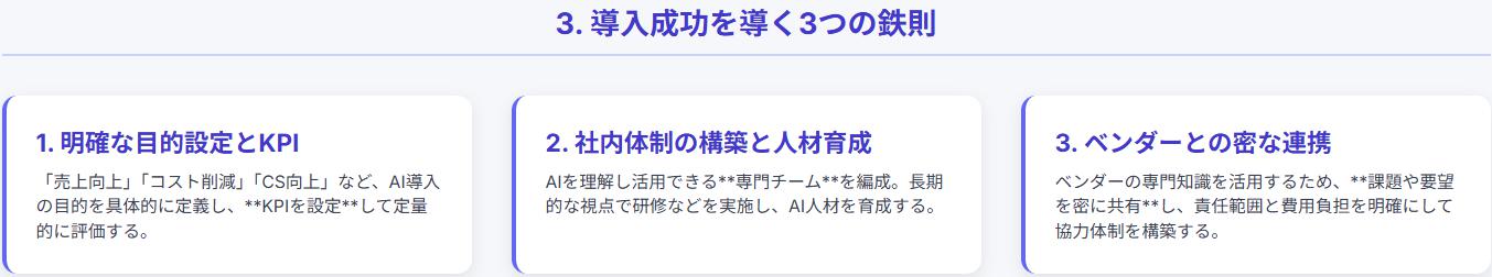 AI導入を成功させるためには、明確な目的設定とKPI(重要業績評価指標)の設定が不可欠です。AIを導入する目的を具体的に定義し、どのような成果を期待するのかを明確にすることで、導入後の効果測定が可能になります。KPIは、AI導入の成果を定量的に評価するための指標であり、売上向上、コスト削減、顧客満足度向上など、目的に合わせて設定します。KPIを設定することで、AI導入の効果を客観的に評価し、改善点を見つけることができます。また、KPIを定期的にモニタリングし、目標達成に向けてPDCAサイクルを回すことが重要です。明確な目的設定とKPIの設定は、AI導入を成功に導くための羅針盤となります。