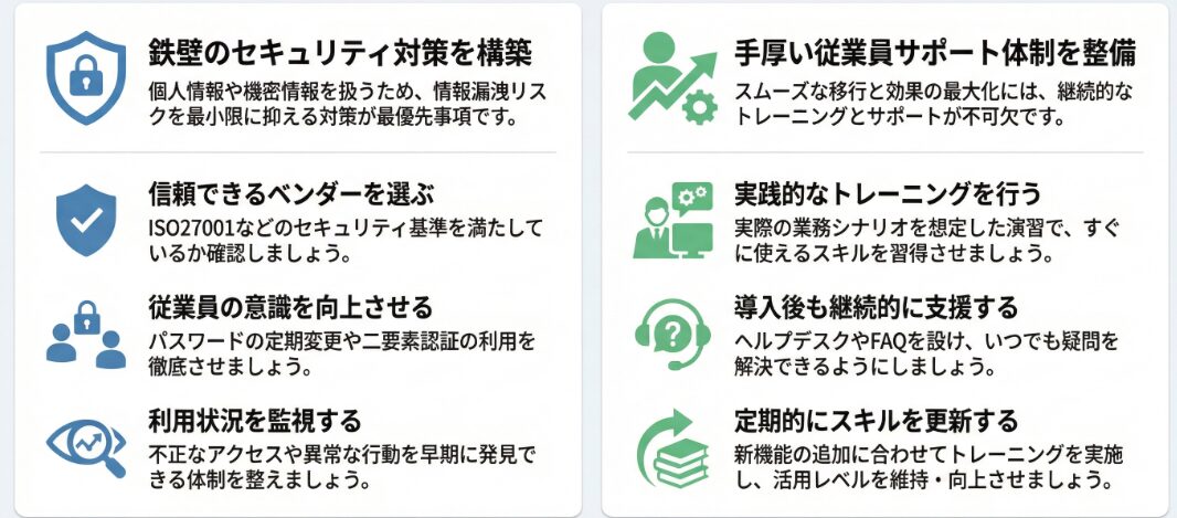 導入後も、従業員からの質問や疑問に対応するためのサポート体制を整える必要があります。