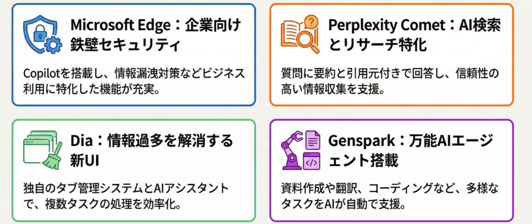 MicrosoftEdgeは、Copilotを搭載し、ビジネスユーザーに特化したAI機能を豊富に備えたブラウザです。