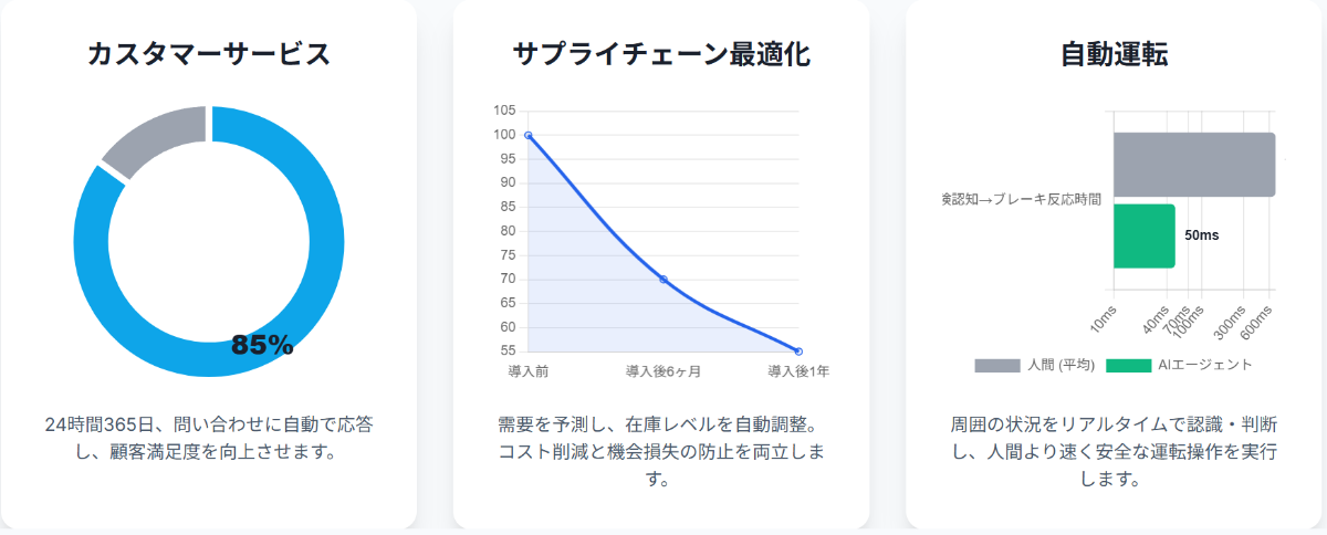 AIエージェントとは、自律的に動作し、特定の目的を達成するために設計されたコンピュータプログラムまたはソフトウェアです。これらのエージェントは、周囲の環境を認識し、その情報を分析し、学習し、最終的に人間の介入なしに意思決定を行うことができます。AIエージェントの主な特徴は、自律性、反応性、学習能力、そして目標指向性です。自律性とは、外部からの直接的な指示なしに動作する能力を指します。反応性とは、環境の変化に迅速に対応する能力のことです。学習能力とは、過去の経験から学び、将来の行動を改善する能力です。目標指向性とは、明確な目標を持ち、それを達成するために行動する能力です。AIエージェントは、これらの特徴を組み合わせることで、複雑なタスクを効率的に実行し、様々な問題を解決することができます。例えば、AIエージェントは、顧客サービスの自動化、サプライチェーンの最適化、または自動運転車の制御などに利用されています。これらの応用例は、AIエージェントが現代社会においてますます重要な役割を果たしていることを示しています。