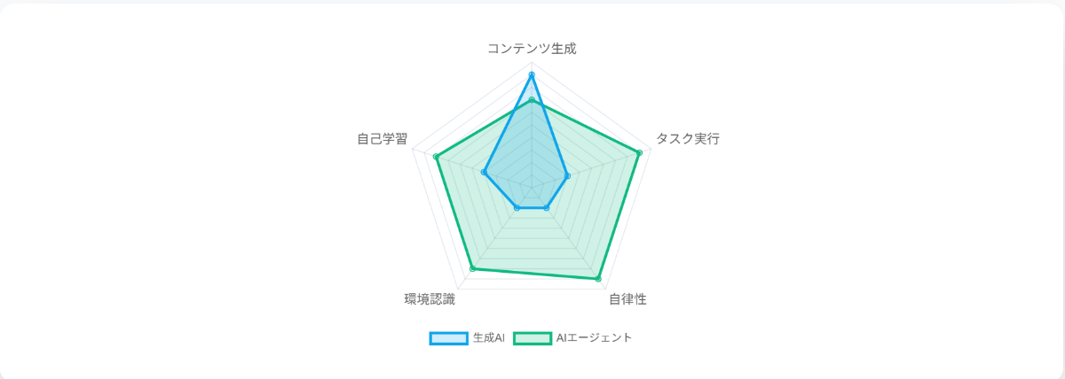 生成AIは、既存のデータに基づいて新しいコンテンツを生成することに特化したAIの一種です。これには、テキスト、画像、音楽、ビデオなどが含まれます。例えば、文章生成AIは、与えられたプロンプトに基づいて記事や詩を書くことができます。画像生成AIは、テキストの説明に基づいて新しい画像を生成できます。一方、AIエージェントは、特定のタスクを実行するために環境を認識し、意思決定を行い、行動する能力を持つAIです。AIエージェントは、生成AIの技術を活用して、より複雑なタスクを実行することもできます。例えば、AIエージェントは、生成AIを使って顧客からの問い合わせに対応するためのテキストを生成したり、製品設計のための新しいアイデアを生成したりすることができます。このように、生成AIとAIエージェントは異なる目的を持つAIですが、相互に補完し合うことで、より高度なタスクを実行することが可能になります。生成AIはAIエージェントの能力を拡張するためのツールとして機能すると言えるでしょう。