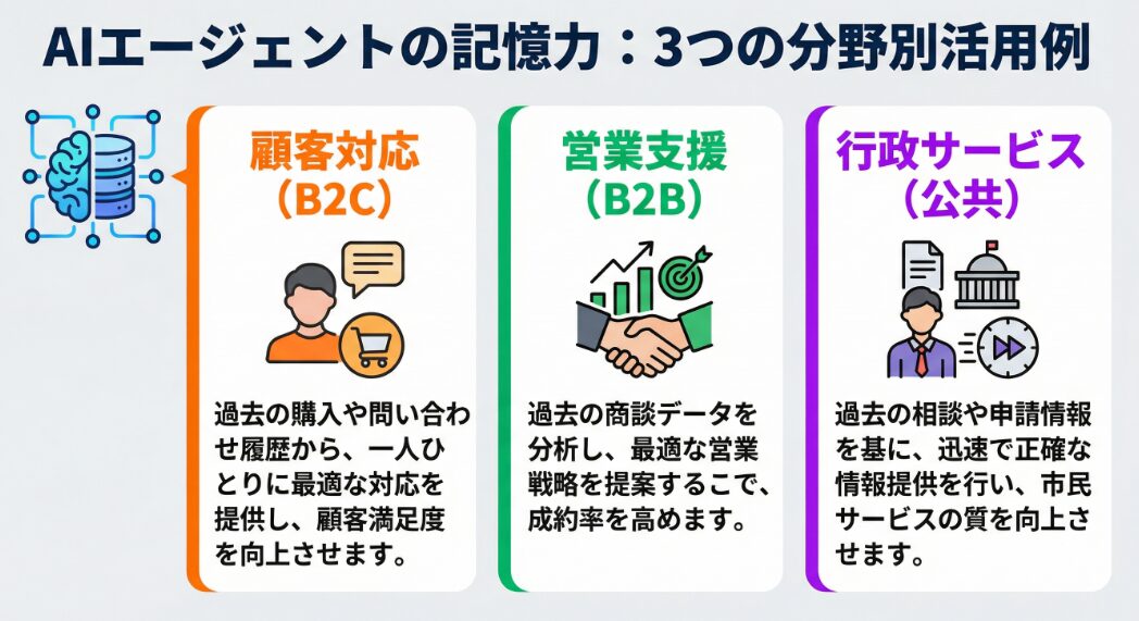 例えば、過去の購入履歴、問い合わせ内容、好みなどを記憶し、顧客がウェブサイトを訪問した際に、パーソナライズされた商品やサービスを推薦することができます。また、過去の問い合わせ内容に基づいて、顧客が抱える問題を迅速に解決することができます。