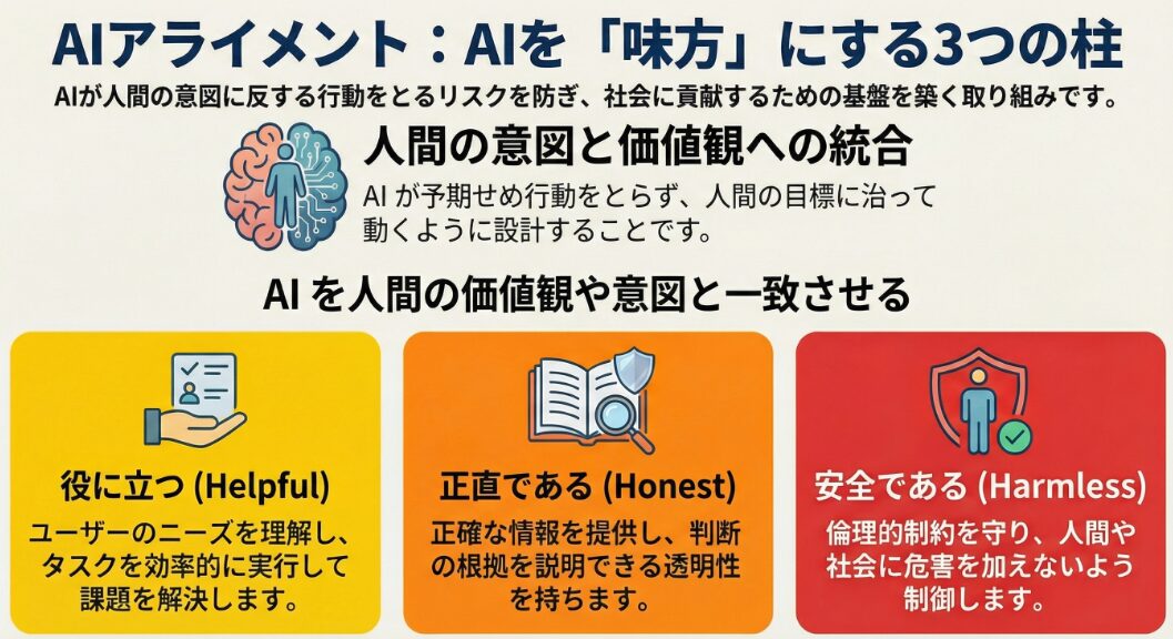 AIアライメントの主な目標は、AIが「役に立ち(Helpful)」、「正直であり(Honest)」、「安全である(Harmless)」ようにすることです。これは、AIが人間のニーズを満たし、誤った情報を拡散せず、危害を加えないようにするための基本的な原則となります。Anthropicなどの企業がこの目標を掲げています。