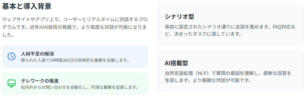 チャットボットは、ウェブサイトやアプリケーション上で、テキストや音声を通じてユーザーとリアルタイムで対話を行うことができるコンピュータープログラムです。近年、AI技術の発展に伴い、従来のシナリオ型に加え、自然言語処理(NLP)や機械学習(ML)を活用したAI搭載型チャットボットが登場し、より高度な対話が可能になりました。シナリオ型は、事前に設定されたシナリオに基づいて会話を進めるため、特定のタスクやFAQ対応に適しています。一方、AI搭載型は、ユーザーの質問内容を理解し、適切な回答を生成できるため、より柔軟な対応が可能です。そのため、チャットボットは、顧客対応、社内ヘルプデスク、マーケティングなど、様々な分野で活用されています。