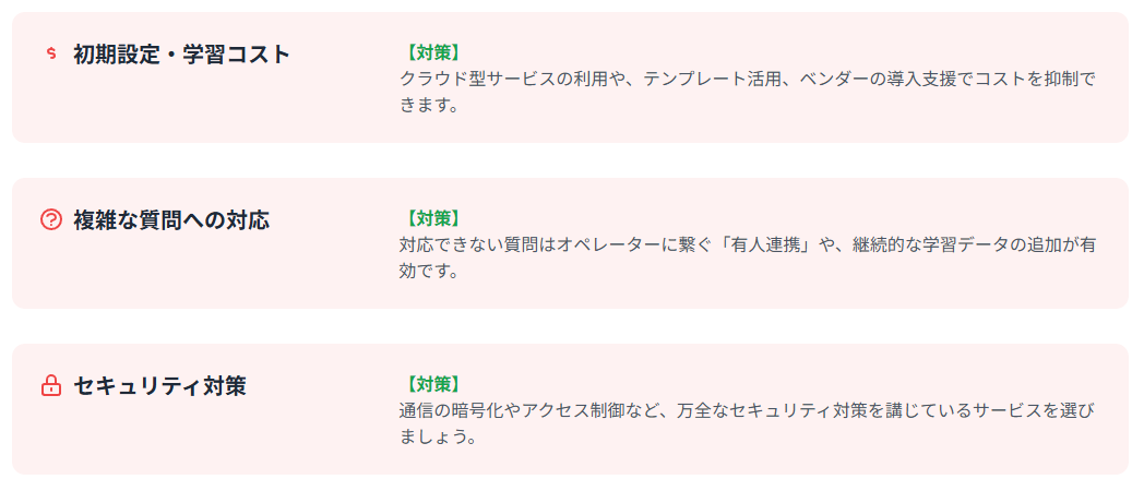 チャットボットは、事前に学習した範囲を超える複雑な質問や、曖昧な表現への対応が苦手な場合があります。特に、AI搭載型チャットボットでも、十分な学習データがない場合や、未知の質問に対しては、適切な回答を生成できないことがあります。このような課題を解決するために、有人チャットとの連携機能を導入することが有効です。チャットボットが対応できない質問は、オペレーターに自動的に転送することで、顧客を待たせることなく対応することができます。また、FAQを拡充し、チャットボットの学習データを増やすことで、対応できる質問の範囲を広げることができます。さらに、チャットボットの回答精度を定期的に評価し、改善を図ることが重要です。