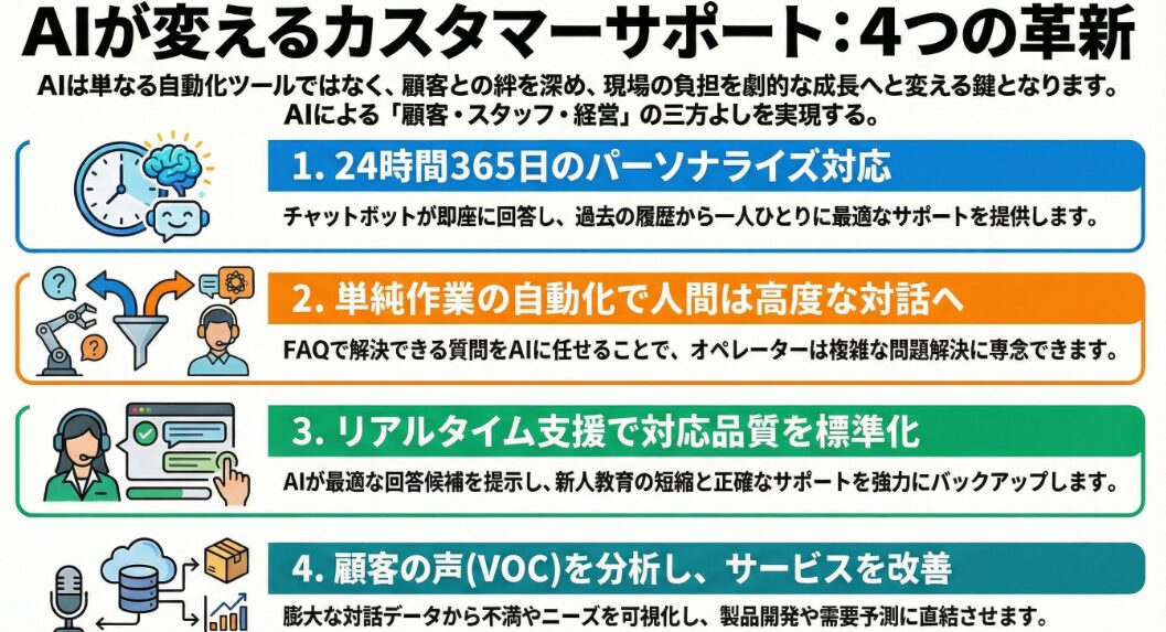 AIの導入は、カスタマーサポートの現場において、オペレーターの負担軽減と効率化に大きく貢献します。繰り返し発生する単純な問い合わせや、FAQで解決できる質問への対応をAIが自動化することで、オペレーターはより複雑で高度な問題解決に集中できるようになります。