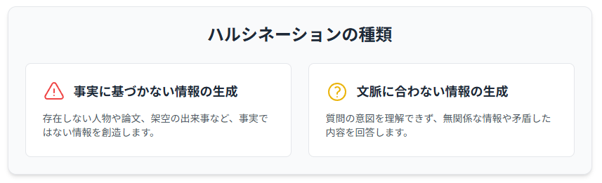 AIのハルシネーションには、大きく分けて「事実に基づかない情報の生成」と「文脈に合わない情報の生成」の2種類があります。前者は、存在しない情報を生成したり、誤った情報を提示したりするもので、後者は、質問や指示とは無関係な情報を生成するものです。事実に基づかない情報の生成は、AIが学習データに存在しない情報を創造したり、既存の情報を誤って解釈したりすることで発生します。例えば、存在しない人物の名前を挙げたり、架空の出来事について語ったりすることがあります。