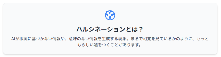 ハルシネーションとは、AI、特に大規模言語モデルが、事実に基づかない、または意味のない情報を生成する現象を指します。まるで幻覚を見ているかのように、もっともらしい嘘をつくことがあります。この現象は、AIが学習データに基づいてテキストを生成する過程で、誤ったパターンを学習したり、存在しない情報を創造したりすることで発生します。