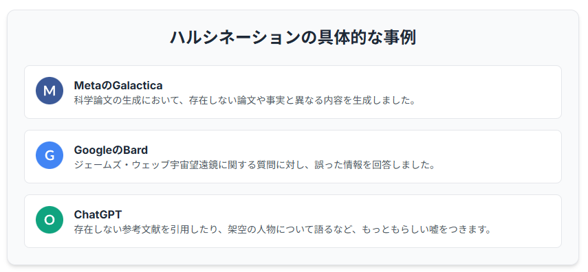 Meta(Facebook)の科学用大規模言語モデル「Galactica」は、科学論文の生成において、事実とは異なる内容や、存在しない論文情報を生成するハルシネーションを起こしました。Galacticaは、科学論文の作成を支援することを目的として開発されたAIモデルでしたが、公開後すぐに、そのハルシネーションの多さが問題視されました。例えば、存在しない論文の著者やタイトルを生成したり、科学的な根拠のない主張をしたりするなどの事例が報告されました。Galacticaが生成した情報は、一見するともっともらしい科学論文のように見えるため、専門家が見ても誤りを見抜くのが難しい場合がありました。