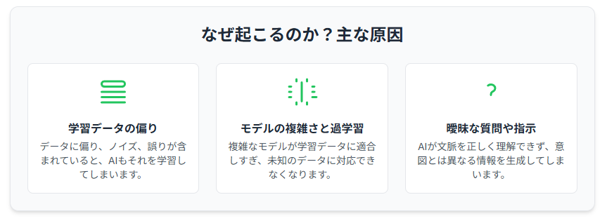 また、学習データに含まれるノイズや誤った情報も、ハルシネーションの原因となります。AIは、学習データに含まれる誤った情報も学習してしまうため、それを基に誤った情報を生成してしまうのです。さらに、学習データが不足している場合も、ハルシネーションが発生しやすくなります。学習データが不足していると、AIは十分なパターンを学習できず、不確かな情報を生成してしまう可能性があります。