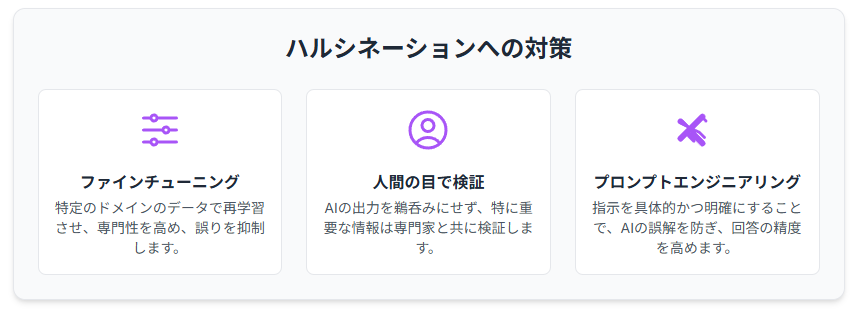 AIのハルシネーションと向き合い、AIを安全に活用するためには、以下の3つの点が重要です。