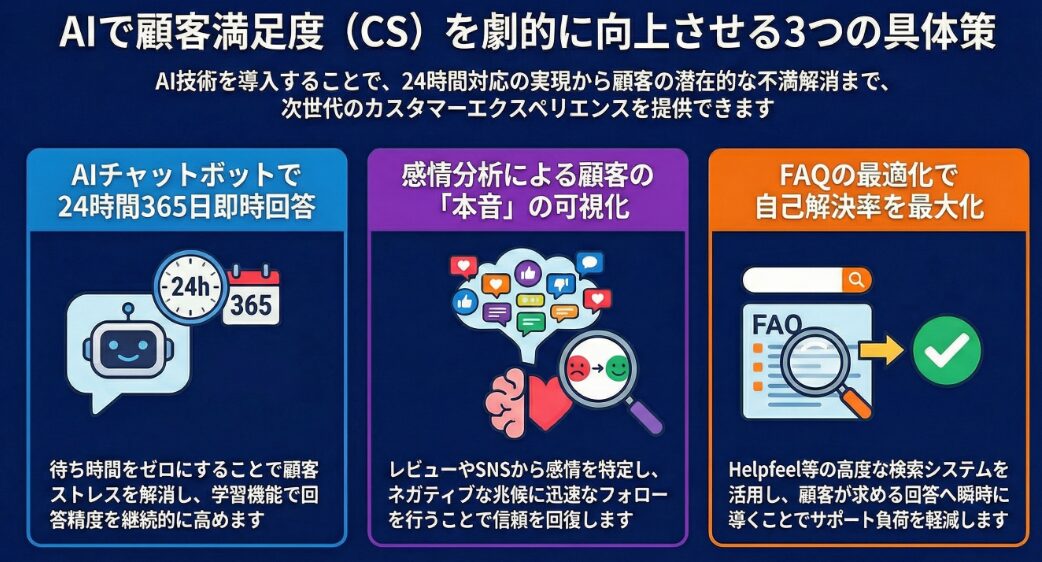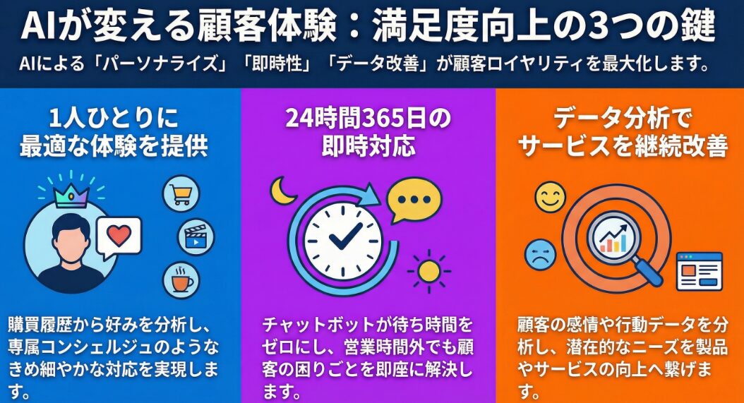 顧客体験のパーソナライズ、 効率的なカスタマーサポート、 データ分析による継続的な改善など、さまざまな方法で顧客満足度向上に貢献できます。