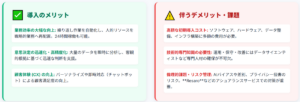 一方、デメリットとしては、導入コストが挙げられます。AIソリューションの導入には、ソフトウェアの購入、ハードウェアの整備、専門知識を持つ人材の育成など、多額の費用がかかる場合があります。