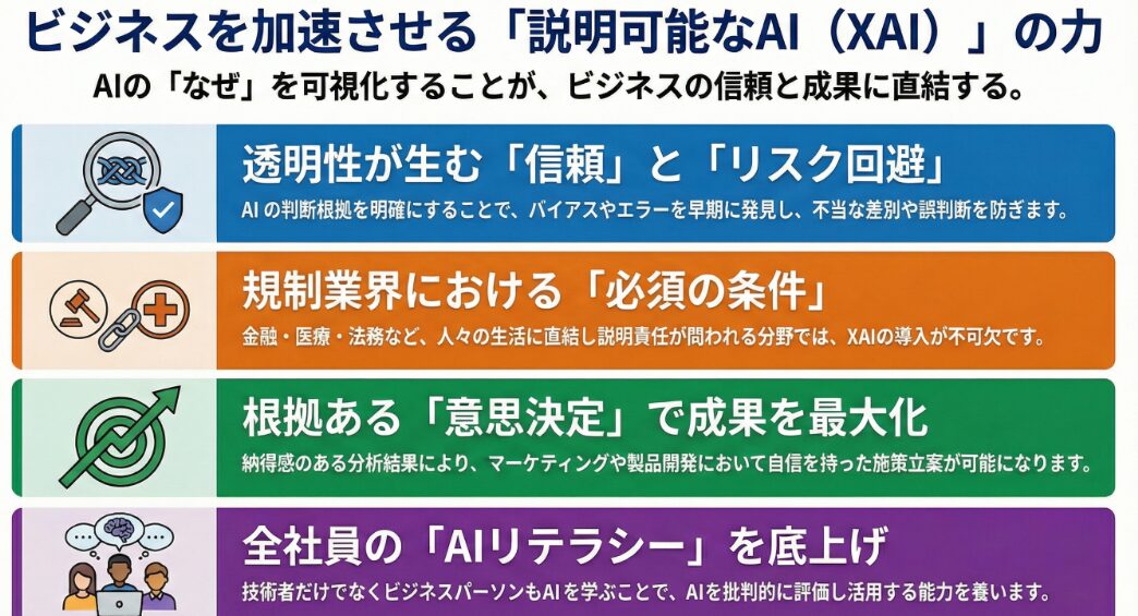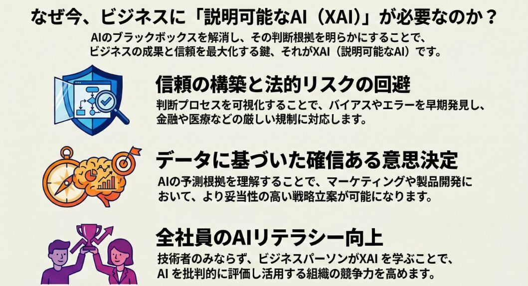 XAIは、AIの判断根拠を明確にすることで、企業がAIのリスクを管理し、信頼性を高めることを支援します。特に、規制が厳しい業界においては、XAIの導入が不可欠となる可能性があります。