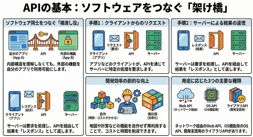 API(Application ProgrammingInterface)は、ソフトウェア開発において重要な役割を果たしています。この記事では、APIの基本的な概念から、その仕組み、種類、活用事例まで、初心者にもわかりやすく解説します。APIを理解し、効果的に活用することで、開発効率の向上や新たなビジネスチャンスの創出につながります。