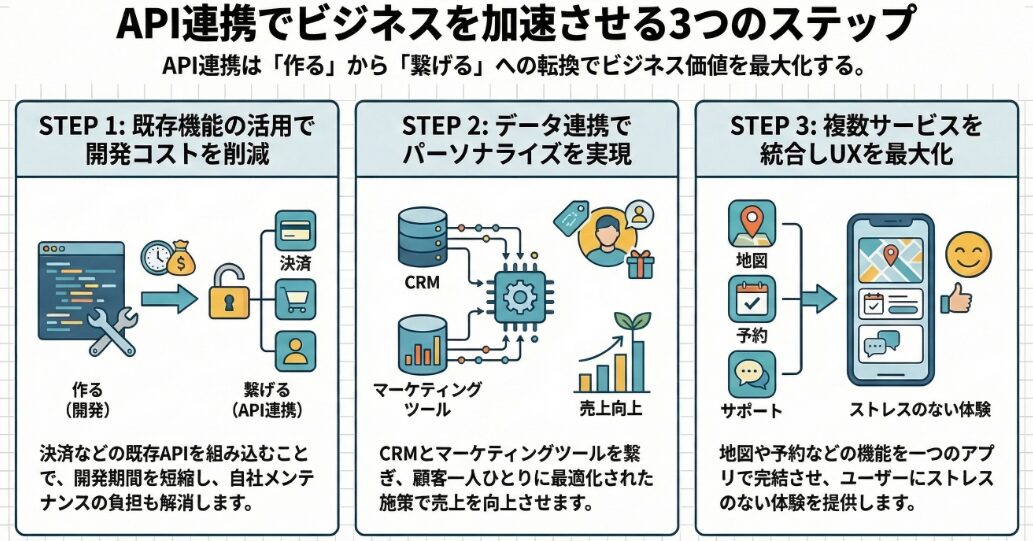例えば、旅行予約サイトでは、航空券、ホテル、レンタカーなどの情報をAPI連携によって一元的に表示し、ユーザーは複数のサイトを比較検討する手間を省けます。API連携は、ユーザーにとって価値のある情報や機能を、より簡単に利用できるようにすることで、顧客満足度を高めます。また、API連携によって、サービスのパーソナライズも可能になり、ユーザー一人ひとりに最適化された情報を提供することで、UXをさらに向上させることができます。API連携は、ユーザー中心のサービスを実現するための重要な要素です。