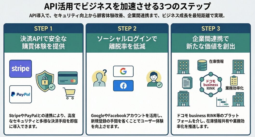 例えば、メーカーと小売業者が在庫情報を共有することで、需要予測の精度を高め、在庫コストを削減できます。また、金融機関とECサイトが連携することで、顧客は、ECサイト上でローンの申し込みや決済を簡単に行えます。企業間連携は、ビジネスの効率化、顧客体験の向上、そして新たなビジネスチャンスの創出に貢献します。ドコモbusinessRINKは、企業間連携を支援するプラットフォームであり、APIを通じて、さまざまな企業システムと連携できます。企業間連携を積極的に推進することで、ビジネスの成長を加速させることができます。