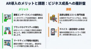 AR(拡張現実)は、現実世界にデジタル情報を重ね合わせる技術です。本記事では、ARの基本から、ビジネスにおける革新的な活用事例、導入のメリット・デメリット、そして未来の展望までを詳しく解説します。ARを活用してビジネスを次のレベルへと引き上げましょう。