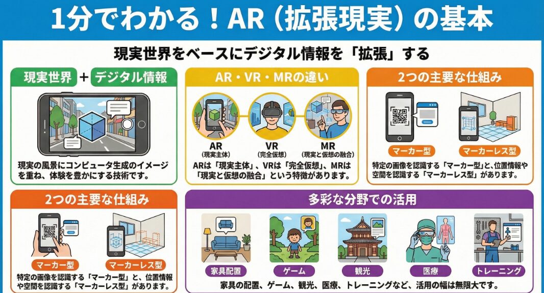 AR(拡張現実)は、現実世界にデジタル情報を重ね合わせる技術です。本記事では、ARの基本から、ビジネスにおける革新的な活用事例、導入のメリット・デメリット、そして未来の展望までを詳しく解説します。ARを活用してビジネスを次のレベルへと引き上げましょう。
