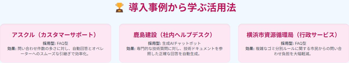 横浜市資源循環局の事例から、チャットボットは、行政サービスの効率化にも貢献することがわかります。特に、市民からの問い合わせが多い行政機関にとっては、チャットボットの導入は、窓口業務の負担軽減と市民サービスの向上に繋がる有効な手段となります。