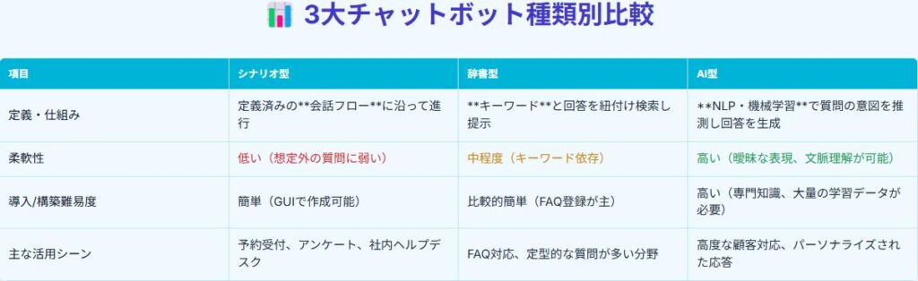 シナリオ型チャットボットは、事前に用意されたシナリオに基づいて会話を進めるため、複雑な質問には対応できませんが、定型的な質問には迅速かつ正確に対応できます。また、シナリオ型チャットボットは、導入が比較的容易で、コストも抑えることができます。