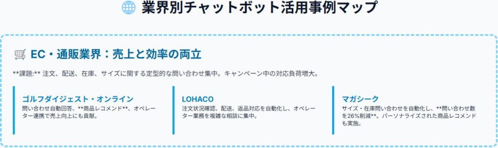LOHACOの事例は、ECサイトにおけるチャットボット導入の成功例として、多くの企業に参考にされています。