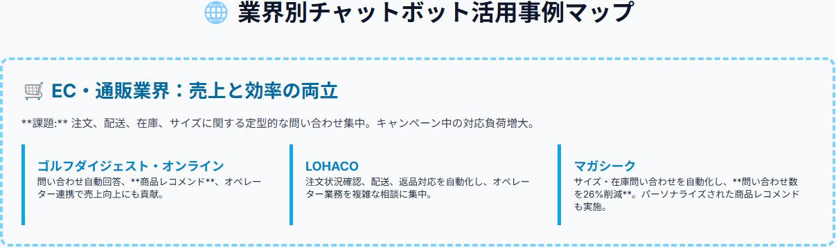EC・通販業界、学校・教育業界、旅行・観光業界など、様々な業界でチャットボットが活用されており、顧客満足度向上や業務効率化に貢献しています。
