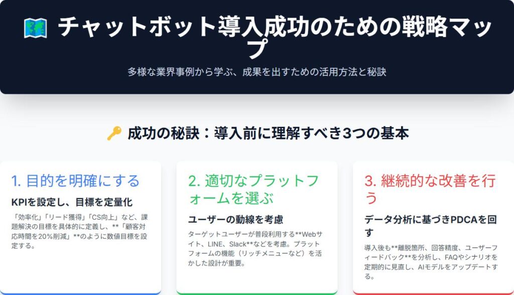 この記事では、チャットボットの導入事例から、成功の秘訣や業界別の活用法を学びました。