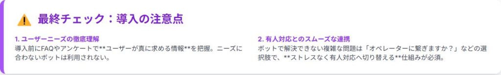 チャットボット導入の際には、ユーザーニーズを理解し、有人対応との連携を考慮することが重要です。