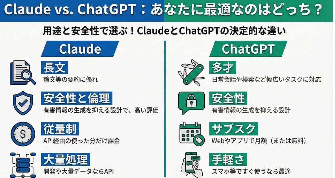 APIを利用して大量のテキストデータを処理する場合はClaude、Webブラウザやアプリから手軽に利用したい場合はChatGPTを選択すると良いでしょう。