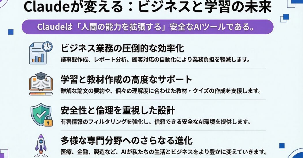 今後、AI技術の進歩とともに、Claudeの活用範囲はさらに広がっていくことが期待されます。