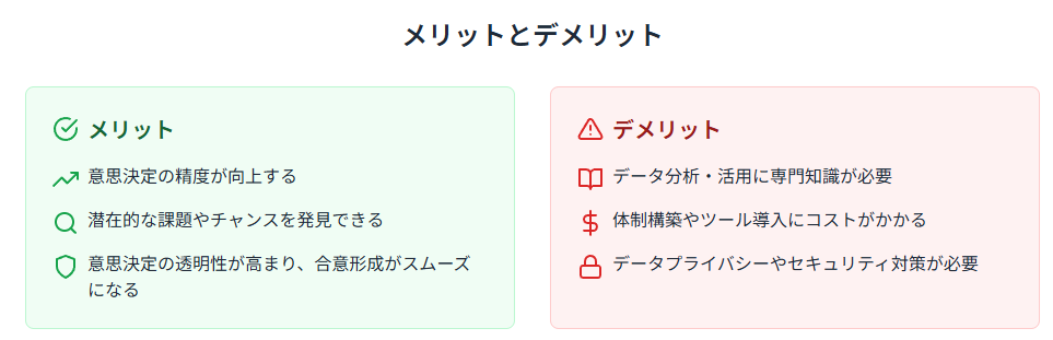 これらのデメリットを克服するためには、外部の専門家やコンサルタントの活用、クラウドベースの分析ツールの導入、社員向けの研修プログラムの実施などが有効な対策となります。初期段階では、スモールスタートでデータドリブンの効果を検証し、徐々に範囲を拡大していくことも、リスクを軽減するための有効なアプローチです。