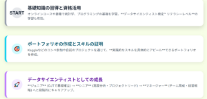 未経験からデータサイエンティストを目指す場合、まずは基礎的な知識を習得することが重要です。オンラインコースや書籍などを活用し、統計学、プログラミング、機械学習の基礎を学びましょう。データサイエンティスト検定™リテラシーレベルの学習も有効です。体系的に学ぶことができるため、効率よく知識を習得できます。オンラインコースでは、実践的なスキルを身につけることができるため、おすすめです。書籍では、理論的な知識を深めることができます。これらの学習を通じて、データサイエンティストに必要な基礎知識を習得し、次のステップに進むための準備をしましょう。学習プラットフォームも充実しており、自分にあった学習方法を見つけやすいでしょう。