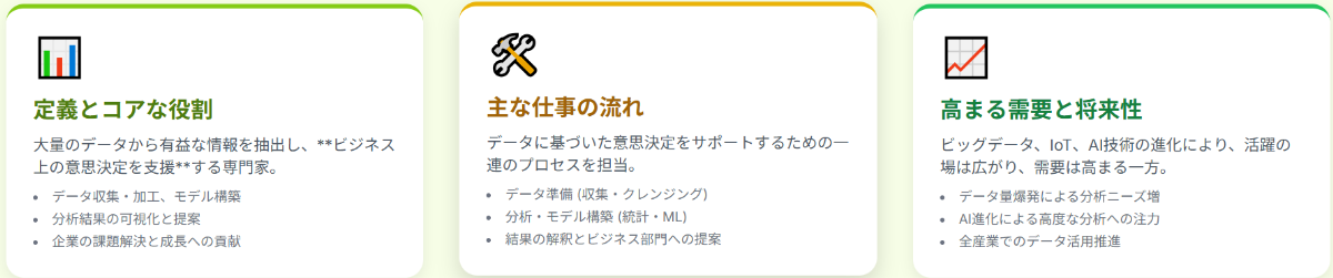データサイエンティストは、データ分析を通じてビジネス課題を解決する専門家です。本記事では、データサイエンティストの役割、必要なスキル、キャリアパス、そしてデータサイエンティスト検定™リテラシーレベルについて詳しく解説します。未経験からデータサイエンティストを目指す方、キャリアアップを考えている方必見です。
