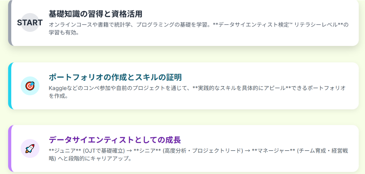 まずはジュニアデータサイエンティストとして、OJTを通して経験を積むのが一般的です。先輩データサイエンティストの指導のもと、データ分析の基礎を学び、スキルアップを目指しましょう。ジュニアデータサイエンティストは、データサイエンティストとしてのキャリアのスタート地点です。OJT(On-the-JobTraining)を通じて、実践的なスキルを習得し、経験を積むことが重要です。先輩データサイエンティストの指導を受けながら、データ分析の基礎を学び、様々なプロジェクトに参加することで、スキルアップを目指しましょう。データ収集、データ加工、データ分析、可視化など、データ分析の一連の流れを経験することで、データサイエンティストとしての基礎を確立することができます。積極的に質問し、学び続ける姿勢が重要です。