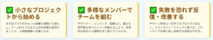 また、小さなプロジェクトであれば、チームメンバーの負担も少なく、より気軽にデザイン思考に取り組むことができます。さらに、小さなプロジェクトで成功を収めることで、組織全体にデザイン思考の有効性を示すことができ、より大規模なプロジェクトへの展開を促進することができます。